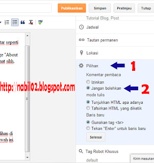 - Buat dulu isi postingannya, kemudian disaat waktu anda membuat postingan, klik Tulisan Pilihan di samping kanan, kemudian Klik centang pada tulisan Jangan Bolehkan. seperti Gambar dibawah ini.